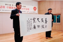 吴兆奇(右)代表茂名书画家向韩国金石研究会会长李汉山赠送书法作品