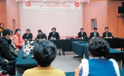 茂名市书画家吴兆奇、廖静等人向韩国书画家介绍茂名书画家展出的作品