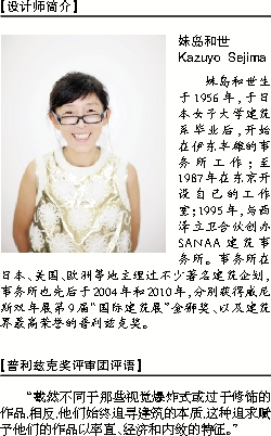 妹岛和世生于1956年,于日本女子大学建筑系毕业后,开始在伊东丰雄的事务所工作;至1987年在东京开设自己的工作室;1995年,与西泽立卫合伙创办SANAA建筑事务所。事务所在日本、美国、欧洲等地主理过不少著名建筑企划,事务所也先后于2004年和2010年,分别获得威尼斯双年展第9届“国际建筑展”金狮奖、以及建筑界最高荣誉的普利兹克奖。