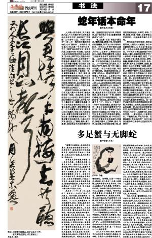 然而对于我来说,由于属蛇,癸巳年又进入第六个本命年,便很关注蛇这一动物。我总在想,这个恐怕百分之九十多的人都对之恐惧的爬行动物为什么会进入到中国人的十二属相中去?翻翻中国典籍,才明了在我国古老的民俗文化中,蛇曾经是受人崇拜、美好事物的象征。作为华夏最早的原始宗教,是以蛇为图腾的,传说中的人类始祖女娲、华夏祖先轩辕氏黄帝均为人面蛇身,故蛇兽被称为始祖神。而象征着中华民族的龙,正是以蛇为其本,给它加上了鳄嘴、鹿角、鹰爪、鱼鳞、蜈蚣尾后所形成的新的形象。龙是蛇的衍化与升华,同根同宗,由于蛇形态小于龙,故属相称谓便成为“小龙”。