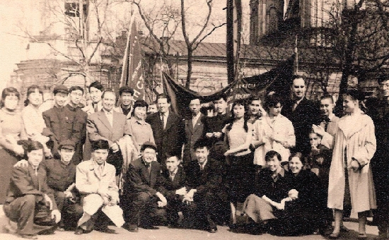 1959年5月,中国留学生与列宾美术学院校长奥列什尼柯夫合影。前排左起张华清、李天祥、周本义、钱绍武、谭永泰、全山石、李玉兰;中后排左起冀晓秋、邓澍、肖峰、邵大箴、郭绍刚、奥列什尼柯夫、周正、奚静之、许治平、徐明华、冯真、程永江。(张华清藏)