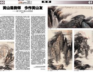 特点之三是时代感之充盈与情感的内蕴使他的作品走出了“新安画派”画家笔下黄山的疏淡、清逸、冷寂的阴柔之境,呈现出清新、和畅、自然、明朗、灵动、劲健、厚重、大气的阳刚之美。他以拥抱新的时代、新的生活热情,以黄山旖旎风光为载体,在回归了部分传统文人画内涵与气质的基础上,由曲高和寡趋向亲近人生的现代化转化。这种转化与古代文人避世、隐逸的超尘自赏有着本质的不同,而与改革开放新时期崛起的民族之魂取得了共鸣。他的画,气象博大沉厚,与中国人的“海纳百川,有容乃大”的胸襟气质相契合;他的画,豪迈壮美,与当代人昂扬奋发的精神面貌互为表里。他的艺术创作以传统笔墨、现代意蕴、绵绵深情的艺术个性,为我们在固定地域拓展山水画审美时空的探索,提供了成功的经验,其独树一帜的面貌,可以说是我们研究传统绘画与当代发展空间中的一个既借古又开今的典范。