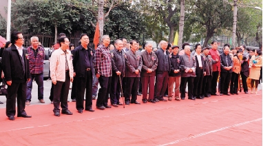 展览开幕式上,参加开幕式的市、区各级领导和艺术家一起站在主席台对面观看狮舞表演。