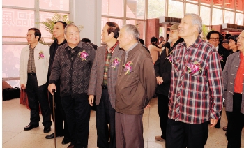 汕头市人大常委会原副主任廖文松先生(左起第2位),汕头市文联副主席、汕头市美协主席许自敬先生(左起第1位),中国美协理事、汕头市美术家协会名誉主席、汕头市中国画院院长陈政明先生一起与参展画家鲁慕迅、李自强、齐辛民等观看展览。