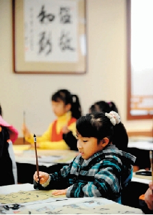 | 3月11日,沈阳市振兴街第二小学学生在新建的专业书法教室里上书法课。从2013年春季开学起,沈阳市将书法教育纳入小学教学体系,学生将分年龄、分阶段修习硬笔和毛笔书法,并将在年内建设370个书法专用教室,保证每所小学至少有一间专用书法教室,并配置桌椅等必需设备和用具。 张文魁 摄 |