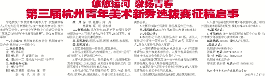 为选拔杭州市优秀青年美术人才,发掘美术新人,并为大运河申遗助力,杭州市美术家协会、杭州市青年联合会、杭州青少年活动中心决定联合举办“第三届杭州青年美术新秀选拔赛”。特发布征稿启事如下: