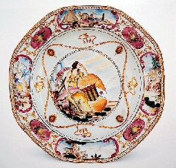 粉彩描金西洋仕女纹八方盘,4个角落的图案代表4个大陆。这是一个显赫的家族定制的。