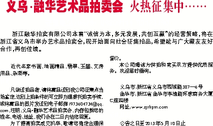 浙江融华拍卖有限公司本着“诚信为本,多元发展,共创互赢”的经营策略,将在浙江省义乌市举办艺术品拍卖会,现开始面向社会征集拍品,希望能与广大藏友友好合作,再创佳绩。