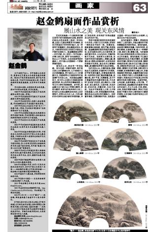 在他的扇画中,更集中、更典型地体现了上述的画风,并显出题材的开拓和意蕴追求并进的特点。读他的扇画,品味画中精致的笔墨、巧妙的构图、迥异的意境,如身临其境,给人一种清新之美、跌宕之美、静穆之美。他的扇画早已走出传统的规范也开拓出关东山水以外的景观。读他的扇画,可以真切地感受到《生生不息》的精神、《江南暮雨》的空濛、《湘西记忆》的浑厚、《潇湘岚晓》的灵秀、《轻舟已过万重山》的险峻、《清凉世界》的幻妙、《山村逸韵》的野趣、《寥廓江天》的荒寒、《清风赏月》的幽静,那老辣苍翠的云壑山涧,那韶秀幽深的茂林鸣泉,那墨彩流溢的关东大地,传递的不是文人的忧患意识与自我遣兴,而是完全出于对祖国山河的热爱和对自然大美的颂扬。这里有传承,也有创新,这里有真诚,也有才情。可以肯定地说,赵金鹤在他的扇画中所显示的创造力,不止于山法、石法、树法、水法、色法的更新与融合,更在于他那胎息于华夏文明的心智和被岁月磨砺的画笔,以及他竭力弘扬的写实主义的山水画精神。
