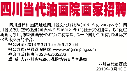 四川当代油画院是经四川省文化厅批准(川文办发[2012]55号)、四川省民政厅正式注册(川民证字笫030121号)的社会文化团体。以“促进油画民族化,推动国画现代化”为办院宗旨,是一个国际性画院,是国际文化艺术交流的平台。