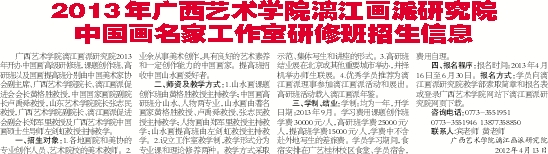 四、报名程序:报名时间:2013年4月16日至6月30日。报名方式:学员向漓江画派研究院教学部索取简章和报名表或登录广西艺术学院网站下漓江画派研究院网页下载。