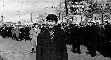 1954年,在列宁格勒首次参加纪念“十月革命”的游行活动(肖峰藏)