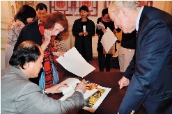 法国巴黎周刚水彩艺术展现场周刚为法国观众签名
