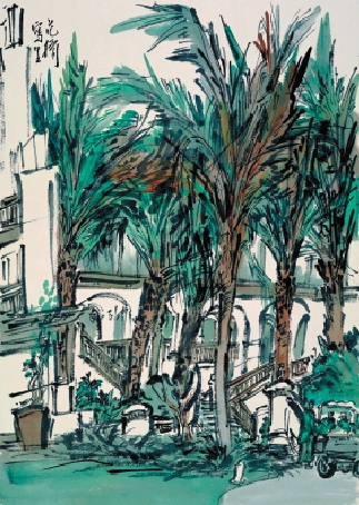 范扬 有棕榈树的宾馆内庭 44.5×32cm 纸本设色 2012年