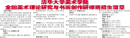 清华大学美术学院为推动全国美术理论研究与书画创作的不断发展,提升广大美术创作者的学术水平,应美术界人士的要求,同时方便在职美术工作者及教师短期(暑假)进修深造,特开办 “全国美术理论研究与书画创作研修班”,以强化提高其美术理论水平与书画创作技能。