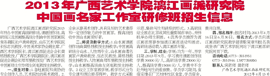 四、报名程序:报名时间:2013年4月16日至6月30日。报名方式:学员向漓江画派研究院教学部索取简章和报名表或登录广西艺术学院网站下漓江画派研究院网页下载。
