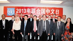 联合国副秘书长吴洪波等联合国官员在“锦绣河山——吴汉华山水画联合国展”上合影。