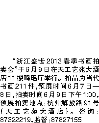 “浙江盛世2013春季书画拍卖会”于6月9日在天工艺苑大酒店11楼鸣瑶厅举行。拍品为当代书画211件,预展时间6月7日—8日,拍卖时间6月9日下午1:00,预展拍卖地点:杭州解放路91号(天工艺苑大酒店)。咨询:87322219,监督:87827155