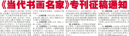 《羲之书画报》以档次高、学术性强、信息量大、图文并茂、印刷精美等特点被广大书画家和读者誉为全国一流的专业书画艺术报,国内统一刊号:CN37-0083。《羲之书画报·当代书画名家》专刊为对开八版,铜版纸彩色精刷,国内外公开发行。为了展示全国各地当代书画家的优秀创作成果和辉煌艺术人生,推介当代书画家的艺术价值。《羲之书画报·当代书画名家》隆重推出当代实力派书法家专版、当代实力派画家专版、当代实力派书画家专版,免费为当代书画家刊登整版。征稿相关事项如下:
