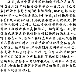 近日,北京中贸圣佳国际拍卖有限公司宣布,将在6月21日的拍卖会中举办一场名为“《也是集》钱钟书书信手稿”的专场拍卖,拍品包括66封钱钟书书信和《也是集》珍贵手稿,12封杨绛书信和《干校六记》手稿,6封钱瑗书信以及沈从文、柯灵等人信件110件。这也是钱钟书的信札、手稿首次大规模地集中亮相拍场。拍卖消息一出,即引来已故著名作家钱钟书遗孀杨绛的强烈反对。对于拍卖一事,当事人杨绛毫不知情,也从未有相关人员和她沟通过,以致于此事让她很受伤害,极为震惊。她不明白,完全是朋友之间的私人书信,本是最为私密的个人交往,怎么可以公开拍卖?并于5月26日发公开信表达了她的愤怒和反对,坚决不同意其本人与钱钟书及女儿的私人书信被拍卖,如果拍卖强行举行她将诉诸法律,维护自己和家人的合法权利。