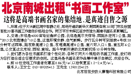 3、我们愿为各位书画家打造个性化的、各种不同大小规格的书画工作室,我们将为您打造出适合您要求的空间。这里将是书画名家作品集中展示自销区、欢迎合作。