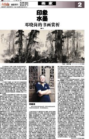 邓晓岗并不停步,在郭怡孮先生指导下,开张视野,突破藩篱,扩大花鸟画境界。近年来他大胆创新了一组水墨森林系列作品。这是他四川青城山、剑阁翠云廊,以及他到云南西双版纳和黑龙江伊春兴安岭林区采风,深入原始林区所体验到的印象,涵泳于心,凝聚印象,发之于笔墨,别有会心。邓晓岗这一批水墨森林作品,我称之为“印象水墨”,以区别于许多山水画家以树石为元素符号或者作为画面穿插点缀之笔墨,又不同于写实绘画雕枝镂叶、巨细靡遗的画法,可谓以己之长独辟蹊径,颇见胆识。这一批森林作品称之为印象,大约是在似与不似之间、实景与意象之间、写生与记忆画之间,看上去水墨淋漓,巨干粗枝,虚虚实实,全凭笔墨干湿浓淡的运用,烘托出一派森郁茂密的林间景象,这个印象又是非常真实的,或者说这样的真实感、身临其境感,又是超越了那种精雕细镂一枝一叶的“真实”,更可贵的是,邓晓岗的“印象水墨”扎根于传统,中国水墨画发展至今已成多样格局,然而一些现代水墨作品抽象得完全用符号组成,大量用水墨肌理制造出视觉的纷繁和混乱,使观者迷茫不知其意。邓晓岗不是这样,他是在传统的基础上寻找新的空间和语言,他大胆地以森林为题材,赋予森林水墨印象,足见其气魄和胆识。他用长锋羊毫饱蘸清水浓墨,大胆落笔、逆推顺拖、侧锋中锋、破锋偏锋、力发千钧,既有书法的线条,又有山水的皴擦,水墨自然在笔中和宣纸上融合,形成丰富的水墨效果。参天树干看似不见笔,而书法用笔均融于其中。邓晓岗又以破笔开花之法,让水墨在宣纸上互破,水墨浓淡均由心生,形成了极有韵味和节奏感的水墨肌理抽象效果,近看是充满水墨神韵的墨花,远看则是林间杂树草丛,观之浮想联翩、回味无穷。其所作的《青城归来》,笔直的树干上几笔潇洒的横枝力度惊人,在整个画面中显得精神而生动。他画的《伊春归来》,两株撑天红松巨干,相当生动感人,其画显然作于归来的画室中,但画面饱有生动印象则是画家难得的再现和驾驭能力的体现。通过这一批作品,我觉得邓晓岗显然在中国水墨画创新和探索方面跨进一大步,前景光明而广阔。邓晓岗是个涉猎多方的全才型人物,他不但在书法绘画方面努力拓展,大有成就,而且在音乐方面无师自通地成了作曲家,所作歌曲广被名家传唱,足见他的艺术基因非凡。不过我更希望看到这位深具才华的画家,以更大的毅力、锲而不舍的精神,凭自己的才华和扎实的功力,心无旁骛地在书画艺术的道路上一步步攀向高峰。
