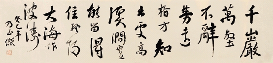 方玉杰 唐诗一首 行书 53×225cm 录唐李忱诗《香严闲禅师》。释文为:千岩万壑不辞劳,远看方知出处高。溪涧岂能留得住, 终归大海作波涛。