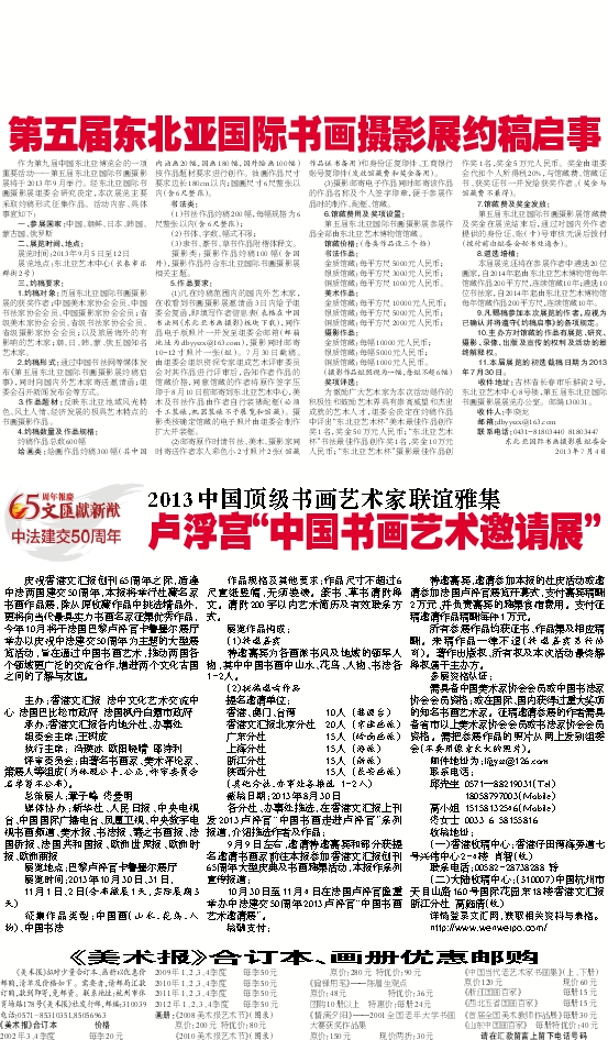 2.约稿形式:通过中国书法网等媒体发布《第五届东北亚国际书画摄影展约稿启事》,同时向国内外艺术家寄送邀请函;组委会召开新闻发布会等方式。