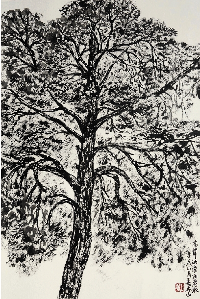 王界山 高耸的澳洲老松 25×37.5cm 焦墨山水画