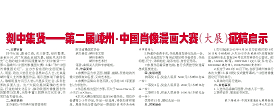 2.拟定于2013年10月下旬,在浙江嵊州市举行本次大赛(大展)颁奖仪式暨开幕式,“中国肖像漫画论坛”同时举行。