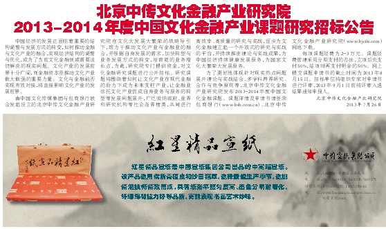 为了更好地体现针对现实热点问题展开理论与实践结合、多学科跨界研究、合作与竞争原则等,北京中传文化金融产业研究院发布2013-2014年度中国文化金融课题。课题详情及申请书请登录包商银行(www.bsb.com.cn)、北京中传文化金融产业研究院(www.bjcfri.com)网站下载。