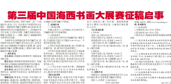 (二)复评结束后邀请书法组优秀奖作者和获奖提名奖作者到泉州参加现场创作交流,当场评审出金奖作品一件。大赛获奖名单将公布在《美术报》、《书法报》和国内主要书画艺术网站。