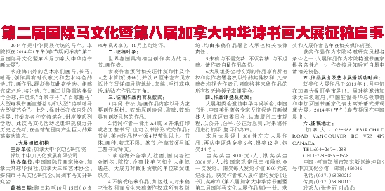 2014年是中华民族传统的马年。本院拟在2014年(甲午)春节期间举办“第二届国际马文化暨第八届加拿大中华诗书画大展”。
