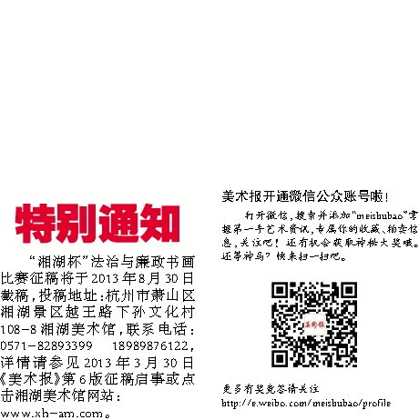 “湘湖杯”法治与廉政书画比赛征稿将于2013年8月30日截稿,投稿地址:杭州市萧山区湘湖景区越王路下孙文化村108-8湘湖美术馆,联系电话:0571-82893399 18989876122,详情请参见2013年3月30日《美术报》第6版征稿启事或点击湘湖美术馆网站: