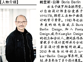 出生于俄罗斯圣彼得堡,以自由设计师身份受雇于VNIITE,拥有工业和平面设计的学习背景。1983年迁往丹麦的他先后成立Boris Berlin Design、加入Penta Design、成为Komplot Design的创立和合伙人,期间其作品曾获多个设计奖项并为全球多家设计博物馆所收藏。2010年他与伙伴创立Iskos-Berlin Design事务所,策划、亲身参与了多个设计展览。