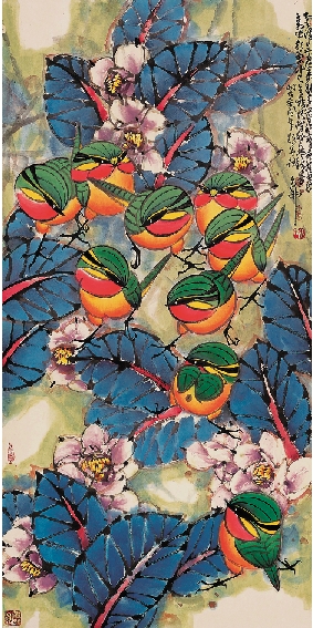 自题诗释文:云涌妆台素艳香,花临宝扇摇曳长;
