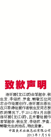 连环画《龙江颂》由邹越非、钱生发、李绍然、罗盘、韩敏五位同志合作绘画创作,连环画出版社在只取得绘画作者钱生发同志授权的情况下,于2012年8月出版连环画《龙江颂》,且未署绘画作者邹越非、钱生发、李绍然、罗盘、韩敏先生的姓名,特此致歉。