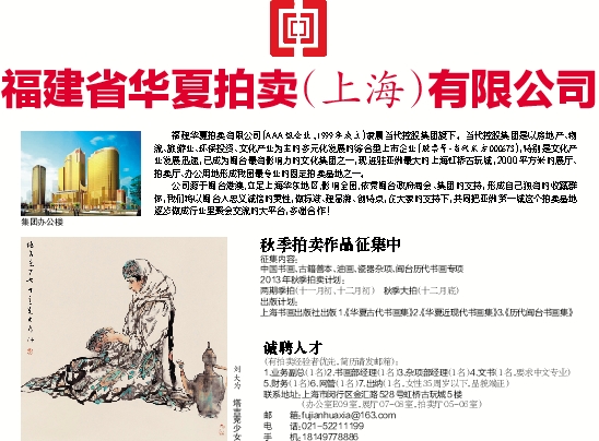 福建华夏拍卖有限公司(AAA级企业、1999年成立)隶属当代控股集团旗下。当代控股集团是以房地产、物流、旅游业、环保投资、文化产业为主的多元化发展的综合型上市企业(股票号:当代东方000673),特别是文化产业发展迅速,已成为闽台最有影响力的文化集团之一,现进驻亚洲最大的上海虹桥古玩城,2000平方米的展厅、 拍卖厅、办公用地形成我国最专业的固定拍卖基地之一。