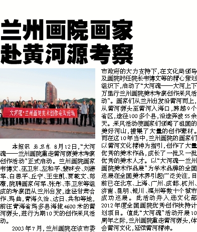 2003年7月,兰州画院在该市委市政府的大力支持下,在文化局领导及画院时任院长韦博文等的精心策划组织下,启动了“大河魂——大河上下万里行兰州画院美术考察创作采风活动”。画家们从兰州出发沿黄河而上,从黄河源头至黄河入海口,跨越9个省区,途径100多个县,沿途奔波55余天。采风活动使画家们领略了祖国的美好河山,搜集了大量的创作素材。而在这10年当中,兰州画院的画家们以黄河文化精神为指引,创作了大量优秀的美术作品,成长了一批又一批优秀的美术人才。以“大河魂—兰州画院美术作品展”为学术品牌的全国巡展在全国美术界引起广泛关注,目前已在北京、上海、广州、成都、杭州、济南、昆明、银川、福州等数十个城市成功巡展。此活动并入选文化部2012年度全国画院优秀创作扶持计划项目。值此“大河魂”活动开展10周年之际,兰州画院重走黄河源头,体会黄河文化,延续黄河精神。