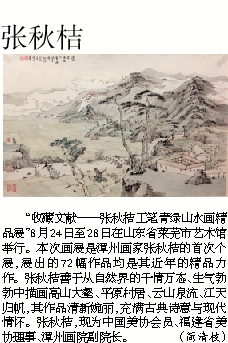 “收藏文献——张秋桔工笔青绿山水画精品展”8月24日至28日在山东省莱芜市艺术馆举行。本次画展是漳州画家张秋桔的首次个展,展出的72幅作品均是其近年的精品力作。张秋桔善于从自然界的千情万态、生气勃勃中描画高山大壑、平原村居、云山泉流、江天归帆,其作品清新婉丽,充满古典诗意与现代情怀。张秋桔,现为中国美协会员、福建省美协理事、漳州画院副院长。 (简清枝)