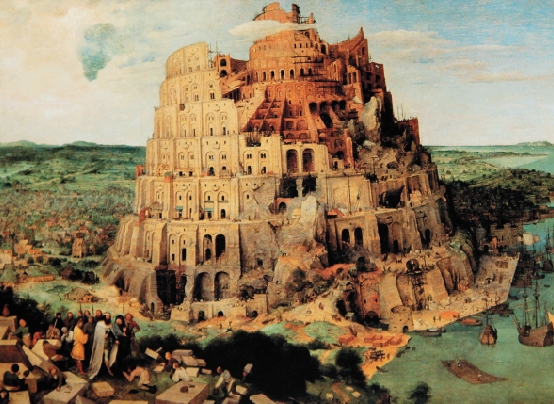 第一种构图的《巴比塔》,塔的一角坍塌了,前面有尼布甲尼撒二世站立。