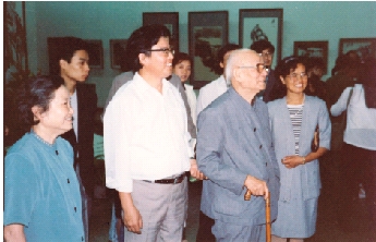 1988年9月拍摄于中国美术馆“渔人张立辰画展”展览会上。前排左起:邹佩珠(李可染夫人)、张立辰、李可染、胡萍。
