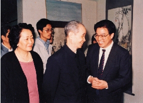 1990年10月上海朵云轩“张立辰画展”开幕式。张立辰与徐邦达先生及其夫人。