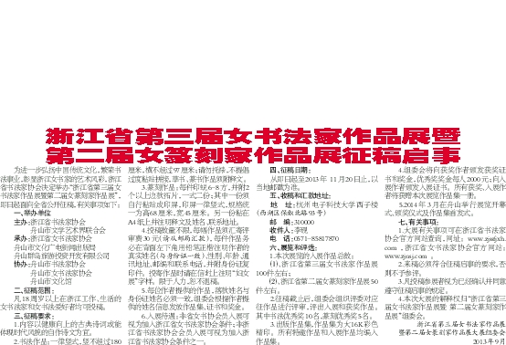 为进一步弘扬中国传统文化,繁荣书法事业,彰显浙江女书家的艺术风彩,浙江省书法家协会决定举办“浙江省第三届女书法家作品展暨第二届女篆刻家作品展”,即日起面向全省公开征稿,有关事项如下: