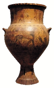 上部画着狄奥米德斯与阿伊亚斯决斗图案、腹部画着阿波罗带翼的马车的黑绘式陶瓶。