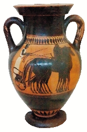 装饰有黑、红、白三色的驾马车人物双耳陶瓶。