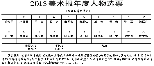 填表说明:投票人同意选择该候选人为年度人物的在对应的空格里画圈,每票限选10人,多选无效;请于2013年11月15日前将选票寄至:浙江省杭州市体育场路178号“美术报年度人物评选办公室”收,邮编:310039;考虑到有些读者需完整保留本报,选票复印有效;网络投票请登录:www.msbw.cn。