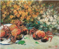 吕洪仁 菊花黄时蟹正肥 布面油画 1998年作 尺寸:50×60cm 约2.7平方尺