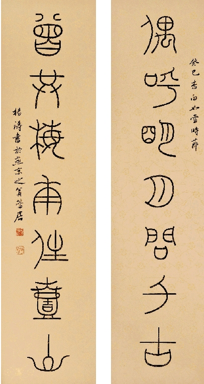杨涛 偶呼曾共联 138×36cm×2 纸本 铁线篆 对联 2013年