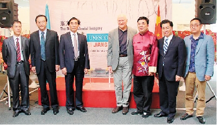出席画展开幕式的人民日报副总编辑陈俊宏(左三)、中国常驻联合国教科文组织大使衔常驻代表尤少忠(右二)、驻法使馆临时代办邓励(左二)、联合国教科文组织文化助理总干事班德林(右四)等嘉宾同画家江源(右三)合影留念。